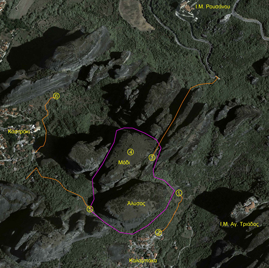 Στα πλαίσια της αναρρίχησης και ανάβασης στο βράχο Μόδι, έγινε αναγνώριση και επίγεια φωτογράφιση των οικοδομικών στοιχείων (θεμελίων και ερειπίων παλαιού καθολικού και οικίσκων κ.λπ.) της κορυφής του, επιτυγχάνοντας μεγαλύτερο βαθμό λεπτομέρειας (Εικόνα 7). Παράλληλα με τη λήψη των εικόνων μετρήθηκαν περίπου 15 φωτοσταθερά σημεία, κάποια εκ των οποίων ήταν προσημασμένα σε σημεία πέριξ των βράχων, όπου επιτρεπόταν η πρόσβαση καθώς και η τοποθέτησή τους στο έδαφος (Εικόνα 8 και 9). Τα υπόλοιπα σημεία ήταν χαρακτηριστικά σημεία στις όψεις των βράχων καθώς και σημεία στο πάνω μέρος του βράχου Μόδι, όπου είχε ανέβει το τοπογραφικό συνεργείο.